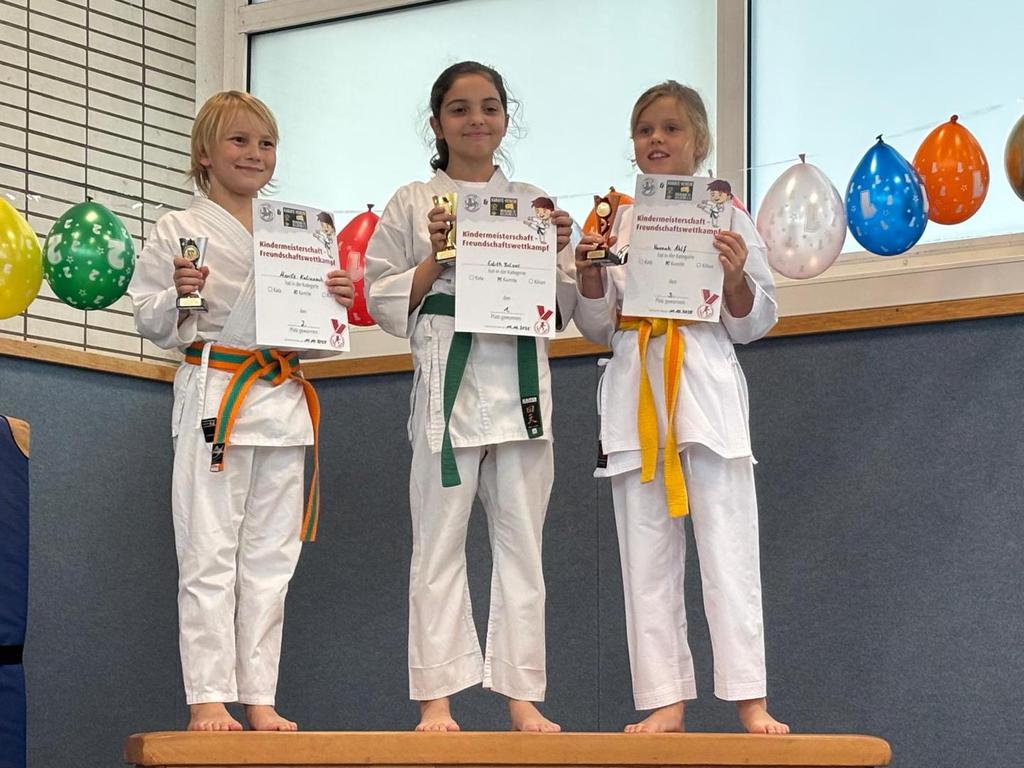 Etwas nervös dagegen waren einige Kinder aus unserem Wettkampfnachwuchs. Drei der Mädchen und drei der Jungen traten im Kumite gegeneinander an. Für die Mädchen, Romy Feld (sieben Jahre), Lilly Stasilo (sieben Jahre) und Mia Waschelewski (acht Jahre) war es der erste Wettkampf überhaupt. Alle drei zeigten, was in ihnen steckt! Trotz der völlig normalen Anspannung und der ungewohnten Situation vor Publikum und Kampfrichtern setzten sie das im Training erarbeitete technische Können sehr gut ein. Dabei schoss Mia Waschelewski den Vogel ab – sie gewann beide Kämpfe und sicherte sich so den Siegerpokal. Zweite wurde Romy Feld, und auf den dritten Platz kam Lilly Stasilo.